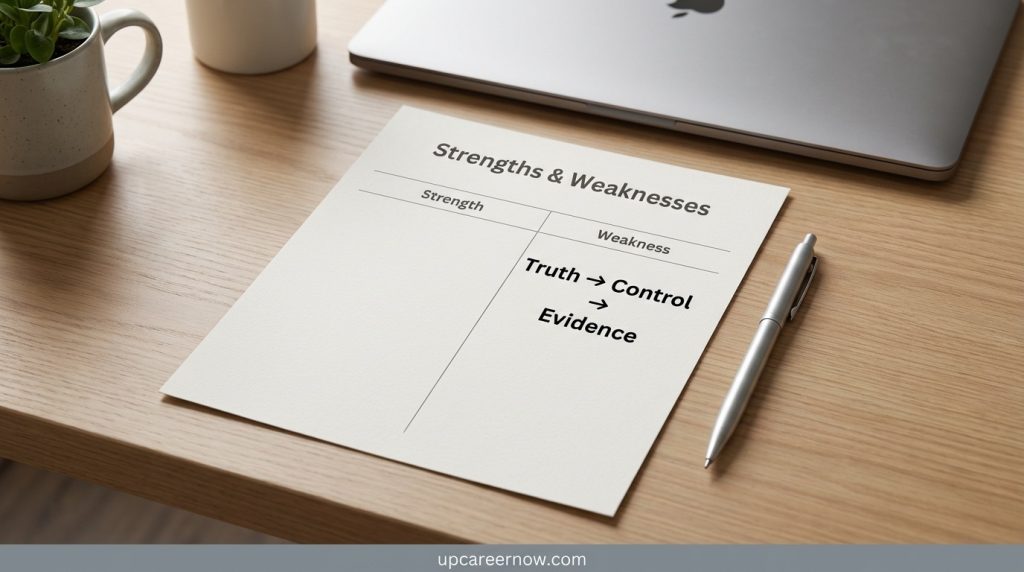 For the weakness part of the strengths and weaknesses interview answer, your goal is to show maturity and control. Use the Truth → Control → Evidence structure.
