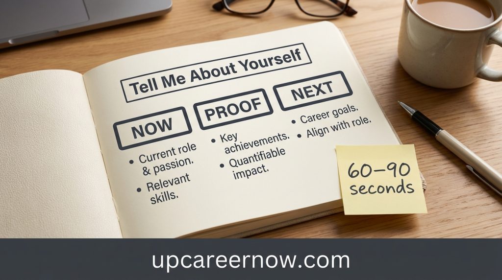 The best tell me about yourself interview answer is a short Now → Proof → Next summary: who you are today, one relevant proof highlight, and why this role makes sense next.